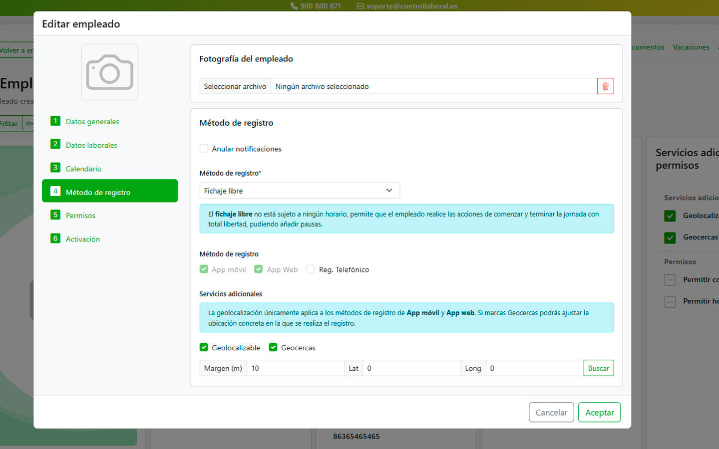 El sistema permite configurar a través de qué medios puede fichar el empleado: